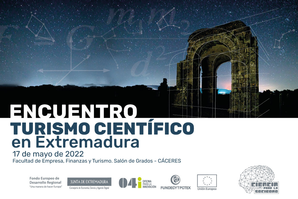 FUNDECYT-PCTEx, organiza el 17 de mayo, en Cáceres, la segunda edición del Encuentro de Turismo Científico concebido para impulsar en Extremadura nuevas iniciativas basadas en un modelo de turismo experiencial desde el conocimiento científico y sus aplicaciones al patrimonio artístico, cultural y natural, y la colaboración entre el sector turístico y la investigación.