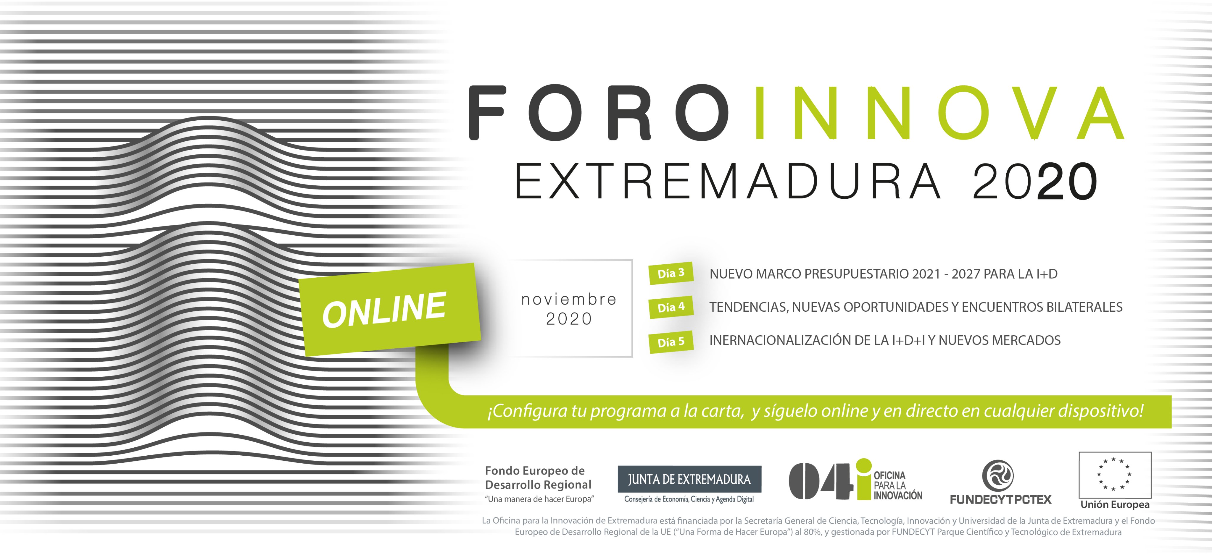 La Junta de Extremadura organiza con FUNDECYT-PCTEx y la Oficina para la Innovación el Foro Innova Extremadura 2020 con un programa a la carta que permite seleccionar un itinerario personalizado y en directo sobre el nuevo marco presupuestario 2021 - 2027 de la I+D+i, las tendencias y oportunidades para empresas, emprendedores e investigadores de Extremadura, y la internacionalización y nuevos mercados para la innovación.